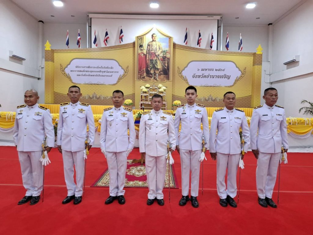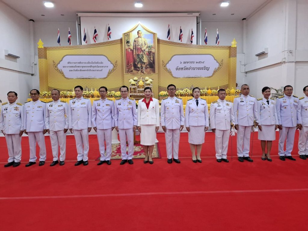 วันที่ 6 เม.ย.68 เวลา 07.00 น.พล.ต.ต.นิพล บุญเกิด ผบก.ภ.จว.อำนาจเจริญ มอบหมายให้ พ.ต.อ.สุทธกาญจน์ ฟักทอง รอง ผบก.ภ.จว.อำนาจเจริญ พร้อมด้วย ร.ต.อ.ทวีศักดิ์ ประดับศรี รองสว.ฝอ.ภ.จว.อำนาจเจริญ ร.ต.ท.สัมฤทธิ์ คนหาญ รอง.สว.(ป)ฯ ร.ต.ต.ธนกฤต เกษมสวัสดิ์ รอง.สว.(ป)ฯและ ร.ต.ต.วีระศักดิ์ ฤาชัย รอง.สว.(ป) กก.สส.ภ.จว.อำนาจเจริญ พร้อมข้าราชการตำรวจ สภ.เมืองอำนาจเจริญ เข้าร่วมรัฐพิธีวันที่ระลึก”พระบาทสมเด็จพระพุทธยอดฟ้าจุฬาโลกมหาราช และวันที่ละลึกมหาจักกรีบรมราชวงศ์” ณ หอประชุมจังหวัดอำนาจเจริญ สวนเฉลิมพระเกียรติ80 พรรษา อำเภอเมืองอำนาจเจริญ จังหวัดอำนาจเจริญ