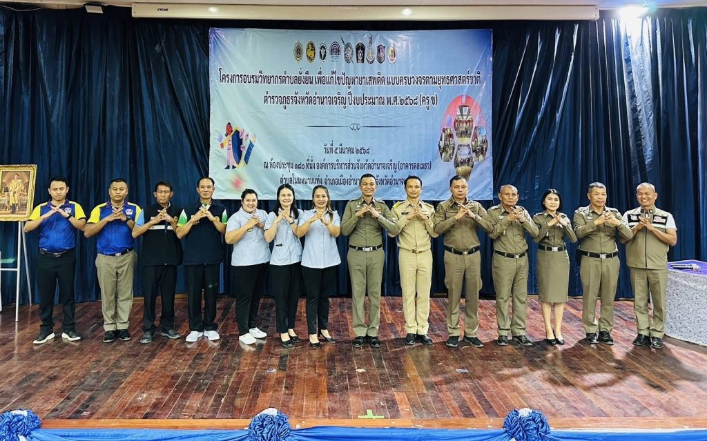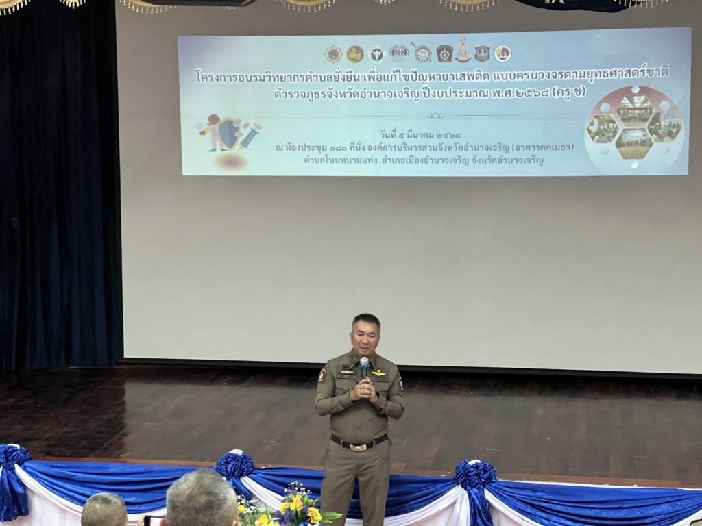 ร่วมพิธีเปิดโครงการอบรมชุดปฏิบัติการ (ครู ข) ตามโครงการดำเนินงานชุมชนยั่งยืนเพื่อแก้ไขปัญหายาเสพติดแบบครบวงจร ตามยุทธศาสตร์ชาติ ตำรวจภูธรจังหวัดอำนาจเจริญ ปีงบประมาณ 2568 เมื่อ 5 มีนาคม 2568 เวลา 09.00 น. ณ ห้องประชุม 180 ที่นั่ง องค์การบริหารส่วนจังหวัดอำนาจเจริญ อาคารดลเมธา ต.โนนหนามแท่ง อ.เมืองอำเจริญ จ.อำนาจเจริญ โดยมีนายณรงค์ เทพเสนา ผู้ว่าราชการจังหวัดอำนาจเจริญ เป็นประธานในพิธี