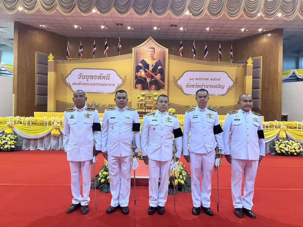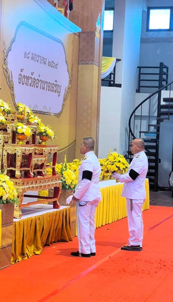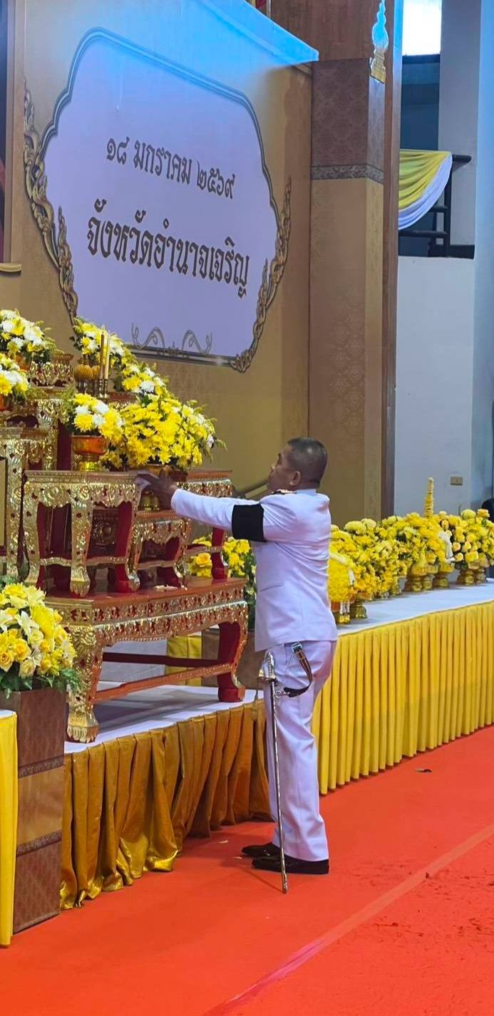 วันที่ 18 ม.ค.69 เวลา 07.00 น. พล.ต.ต.นิพล บุญเกิด ผบก.ภ.จว.อำนาจเจริญ มอบให้ พ.ต.อ.ชัชนันต์ พรบุตร รอง ผบก.ภ.จว.อำนาจเจริญ พร้อมด้วย ข้าราชการตำรวจในสังกัด ภ.จว.อำนาจเจริญ เข้าร่วมงานรัฐพิธีวันสมเด็จพระนเรศวรมหาราช (วันยุทธหัตถี) ประจำปี 2569 ณ หอประชุมพญานาครินทร์ ศาลากลางจังหวัดอำนาจเจริญ