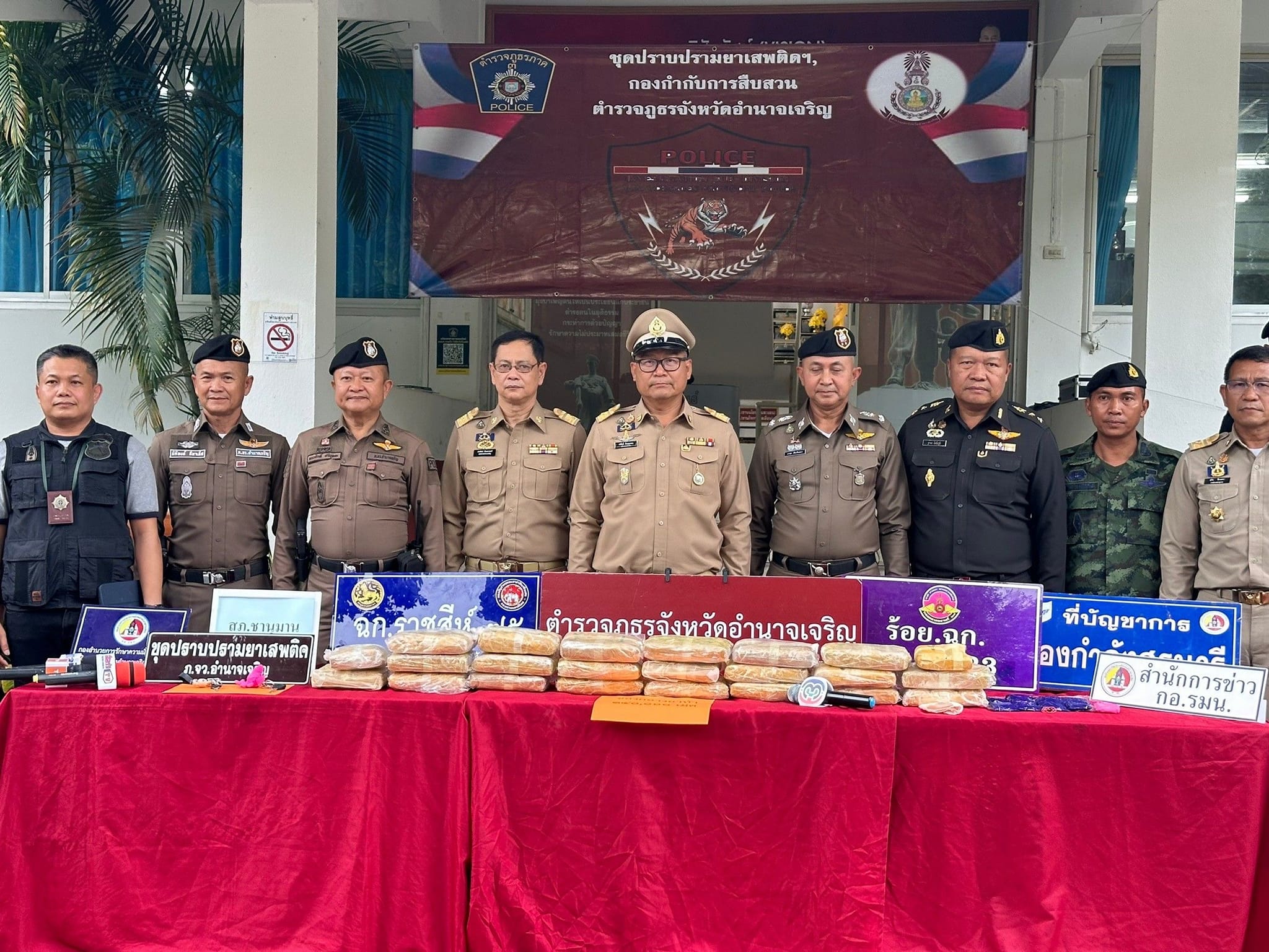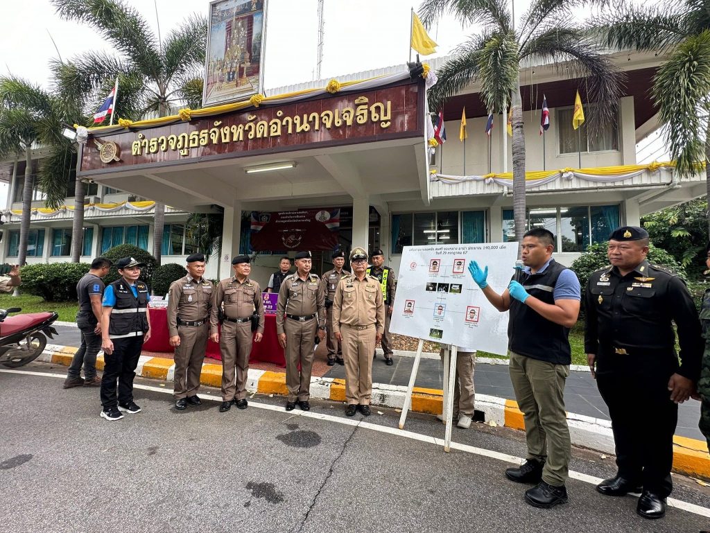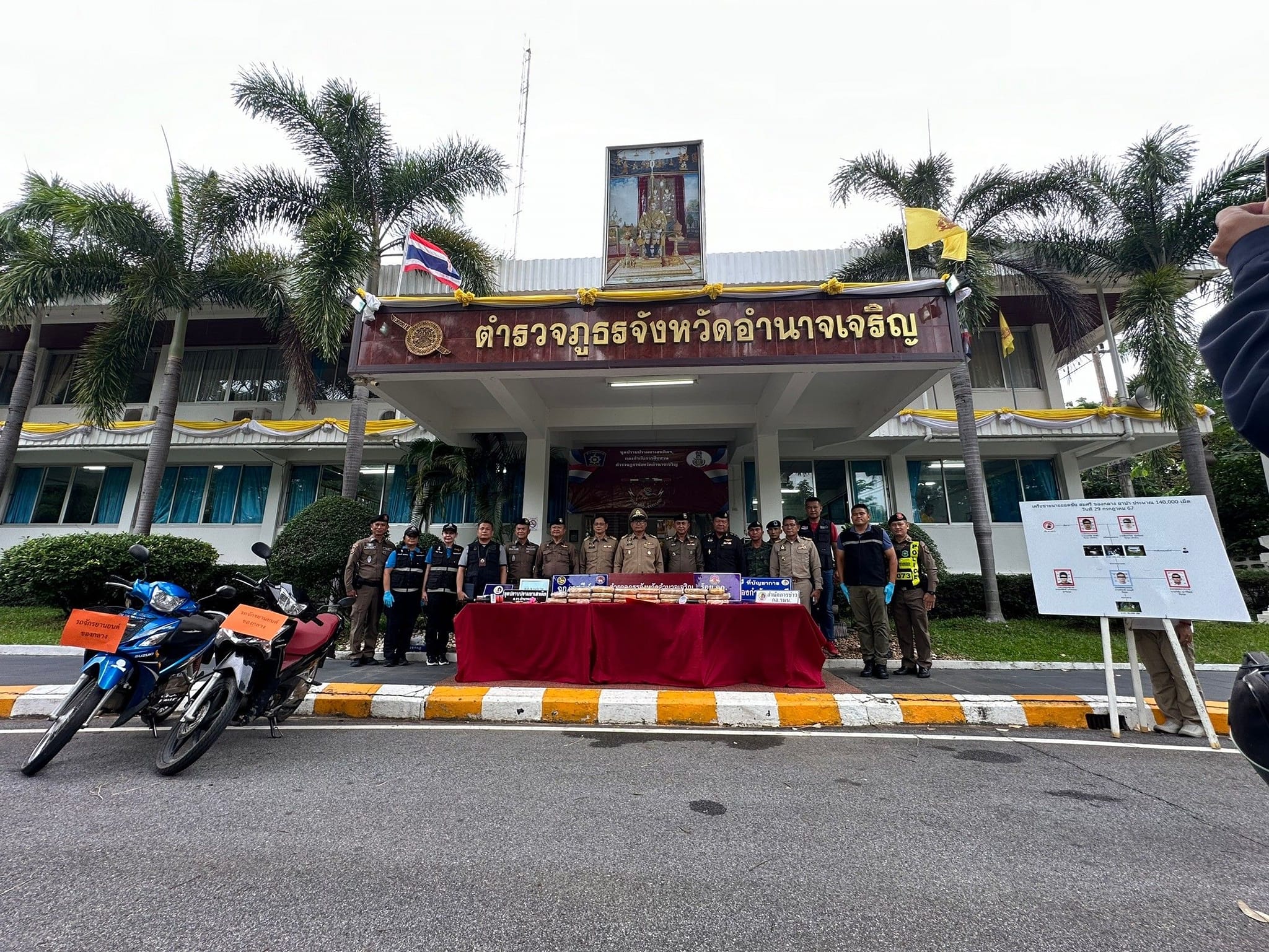 วันที่ 30 ก.ค.67 เวลา 16.00 น. ว่าที่ พ.ต.อดิศักดิ์ น้อยสุวรรณ ผวจ.อำนาจเจริญ ร่วมกับ พล.ต.ต.มารุต เรืองจินตนา ผบก.ภ.จว.อำนาจเจริญ , พ.อ.ฐาพล อ้อชัยภู ผอ.กอ.รมน.จังหวัดอำนาจเจริญ ,ฝ่ายปกครอง ร่วมกันแถลงข่าวการจับกุมคดียาเสพติด ที่เจ้าหน้าที่ตำรวจ กก.สส.ภ.จว.อำนาจเจริญ ,เจ้าหน้าที่ตำรวจ สภ.ชานุมาน เจ้าหน้าที่ ร้อย.ฉก.ทพ.23 ได้จับกุมผู้ต้องหา จำนวน 2 คน