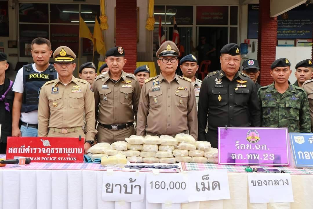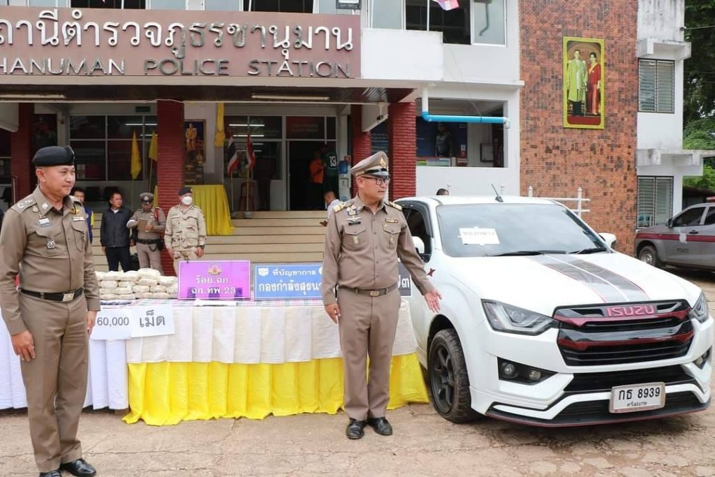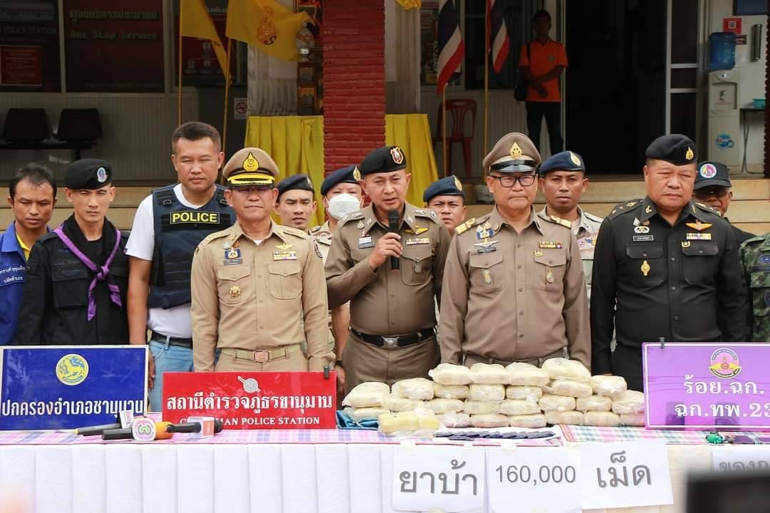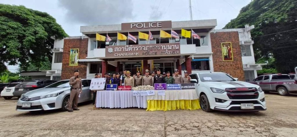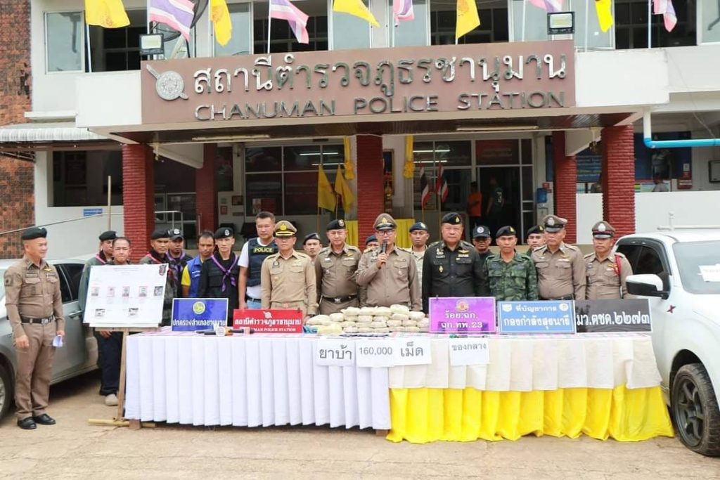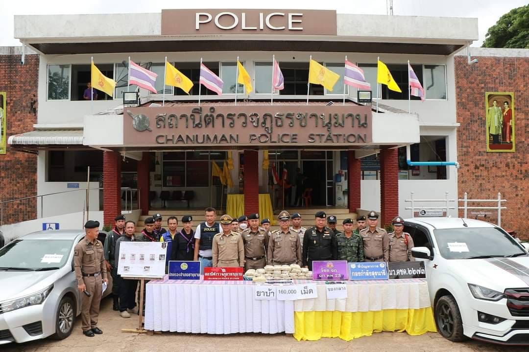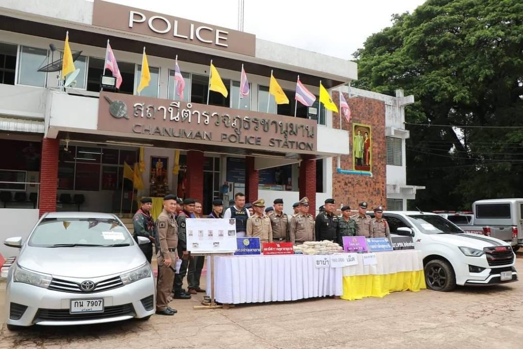 วันที่ 31 ก.ค. 67 เวลา 11.00 น. ณ บริเวณด้านหน้าสถานีตำรวจภูธรชานุมาน อำเภอชานุมาน จังหวัดอำนาจเจริญ ว่าที่พันตรี อดิศักดิ์ น้อยสุวรรณ ผู้ว่าราชการจังหวัดอำนาจเจริญ พร้อมด้วย พลตำรวจตรีมารุต เรืองจินตนา ผู้บังคับการตำรวจภูธรจังหวัดอำนาจเจริญ พันเอกฐาพล อ้อชัยภูมิ รองผู้อำนวยการรักษาความมั่นคงภายในจังหวัดอำนาจเจริญ พันจ่าเอก สุวิน ห้องแซง นายอำเภอชานุมาน พร้อมด้วย เจ้าหน้าที่ที่เกี่ยวข้องร่วมแถลงข่าวการจับกุมคดียาเสพติดของกลางยาบ้า รวม 160,000 เม็ด โทรศัพท์เคลื่อนที่ จำนวน 2 เครื่อง รถยนต์เก๋ง ยี่ห้อโตโยต้า รุ่น ZRE141R-GEPEKT A1 สีเทา หมายเลขทะเบียน กน 7907 สุรินทร์ จำนวน 1 คัน รถยนต์นั่งส่วนบุคคลไม่เกิน 7 คน ยี่ห้ออีซูซุ รุ่น D-MAX สีขาว หมายเลขทะเบียน กธ 8939 ศรีสะเกษ จำนวน 1 คัน พร้อมผู้ต้องหา 4 คน