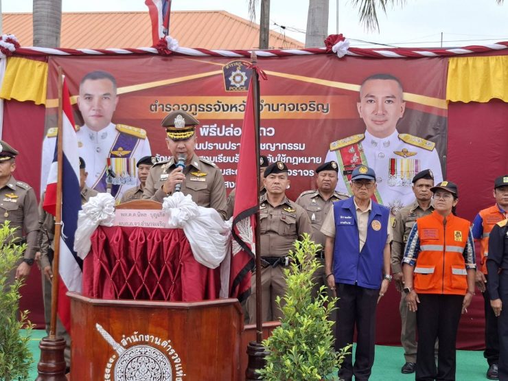 วันที่ 10 เม.ย.68 เวลา 17.00 น.พล.ต.ต.นิพล บุญเกิด ผบก.ภ.จว.อำนาจเจริญ เป็นประธานพิธีปล่อยแถวป้องกันปราบปรามอาชญากรรมรักษาความสงบเรียบร้อย และอำนวยความสะดวกด้านการจราจร ในช่วงเทศกาลสงกรานต์ 2568 โดยมี พ.ต.อ.ชัชนันต์ พรบุตร รอง ผบก.ภ.จว.อำนาจเจริญ,พ.ต.อ.จักรกฤษณ์ โพธิ์กราน รอง ผบก.ภ.จว.อำนาจเจริญ, หัวหน้าสถานีตำรวจในสังกัด ภ.จว.อำนาจเจริญ พร้อมชุดปฏิบัติการเข้าร่วมปล่อยแถว ประกอบด้วย ข้าราชการตำรวจในสังกัด ภ.จว.อำนาจเจริญ, ตำรวจพิสูจน์หลักฐานอำนาจเจริญ, ตำรวจทางหลวงอำนาจเจริญ,ตำรวจตรวจคนเข้าเมืองอำนาจเจริญ เจ้าหน้าที่ฝ่ายปกครอง,เจ้าหน้าที่สรรพสามิต, เจ้าหน้าที่สาธารณสุข, อาสาสมัครป้องกันภัยฝ่ายพลเรือน, อาสาสมัครกู้ภัย รวมทั้งสิ้น จำนวน 200 นาย ณ สวนสาธารณะมิ่งมงคล(หอนาฬิกา)